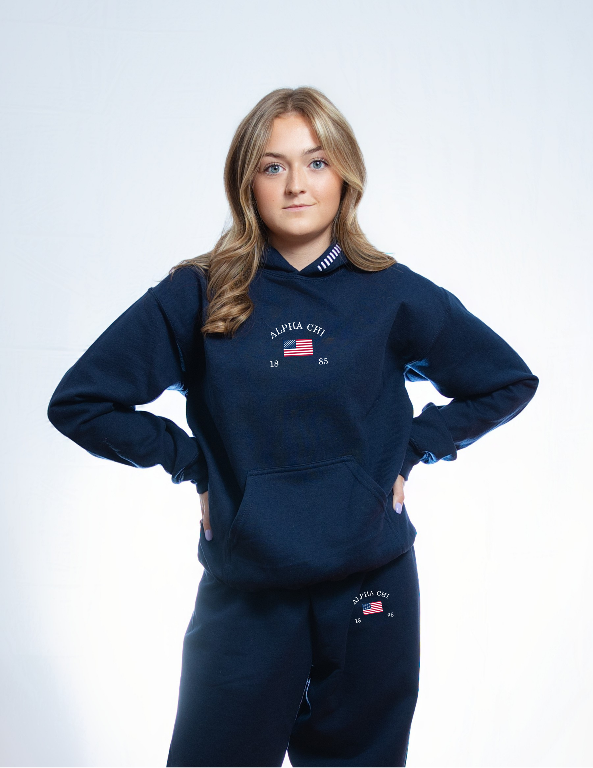 The designs on the hoodie are applied with fine-thread stitch embroidery.