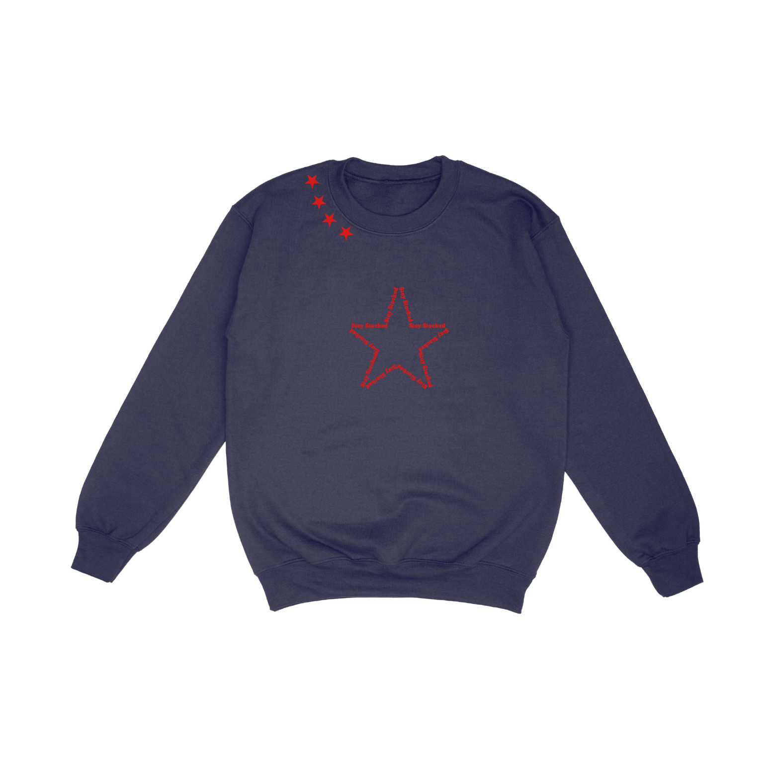 The designs on the crewneck are applied with fine-thread stitch embroidery.