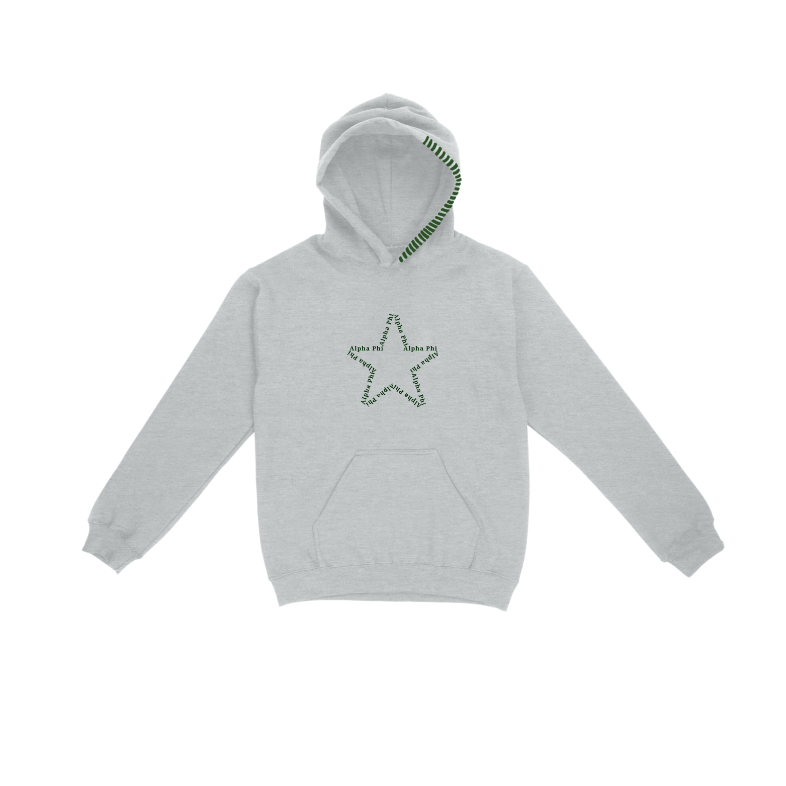 The designs on the hoodie are applied with fine-thread stitch embroidery.