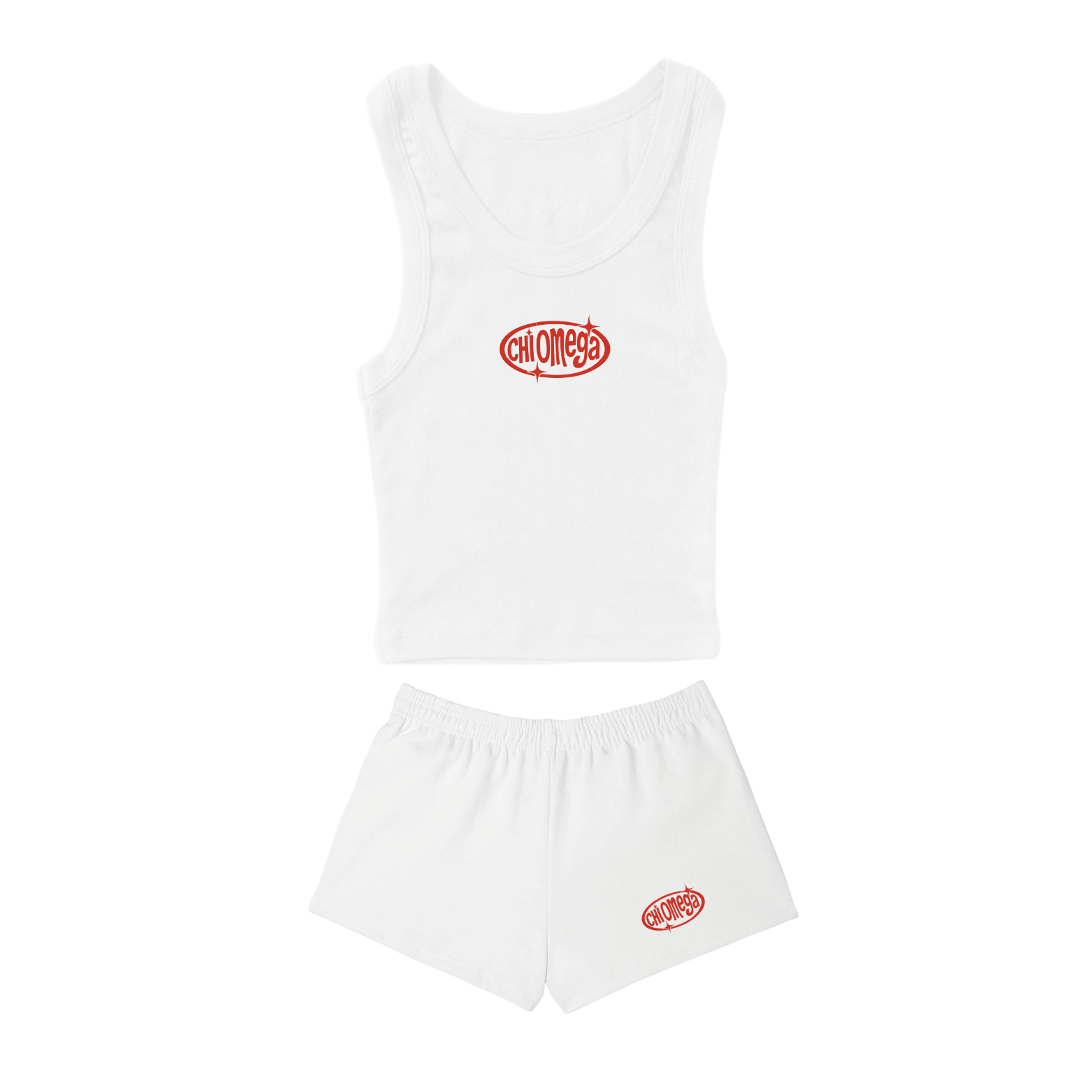 The design on the sweatshorts is applied with fine-thread stitch embroidery.