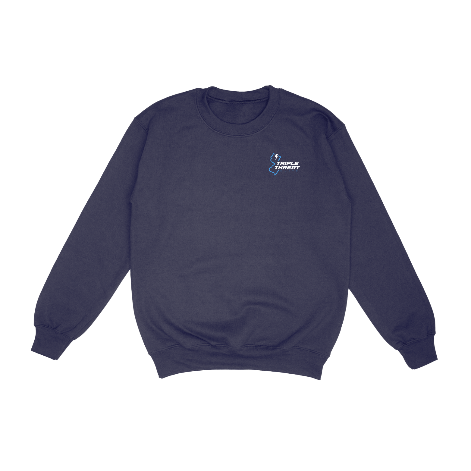 This Crewneck design features a "Triple Threat Elite" text applied with fine-thread stitch embroidery.